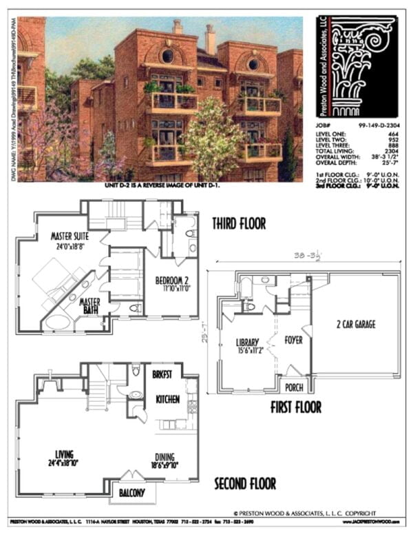 This townhome floor plan has 2304 square feet of living space. This townhome plan has a depth of 25′-7″ and a width of 38′-3 1/2″.