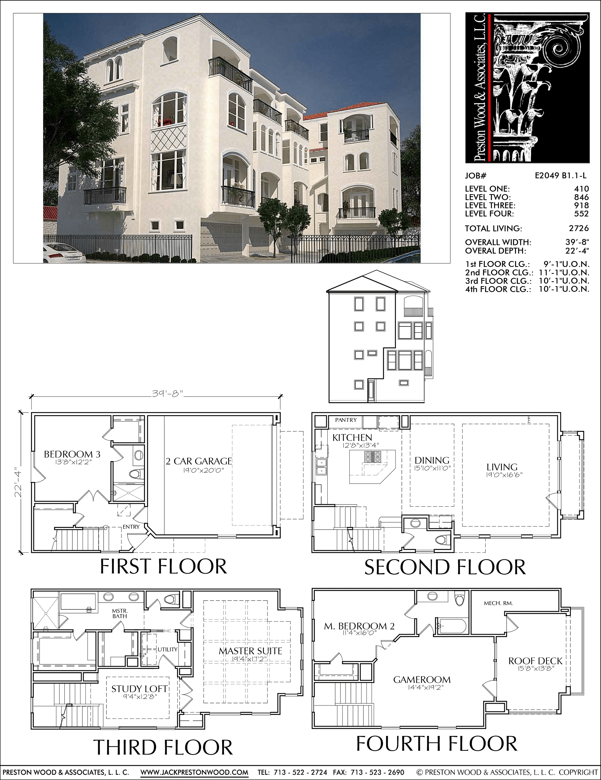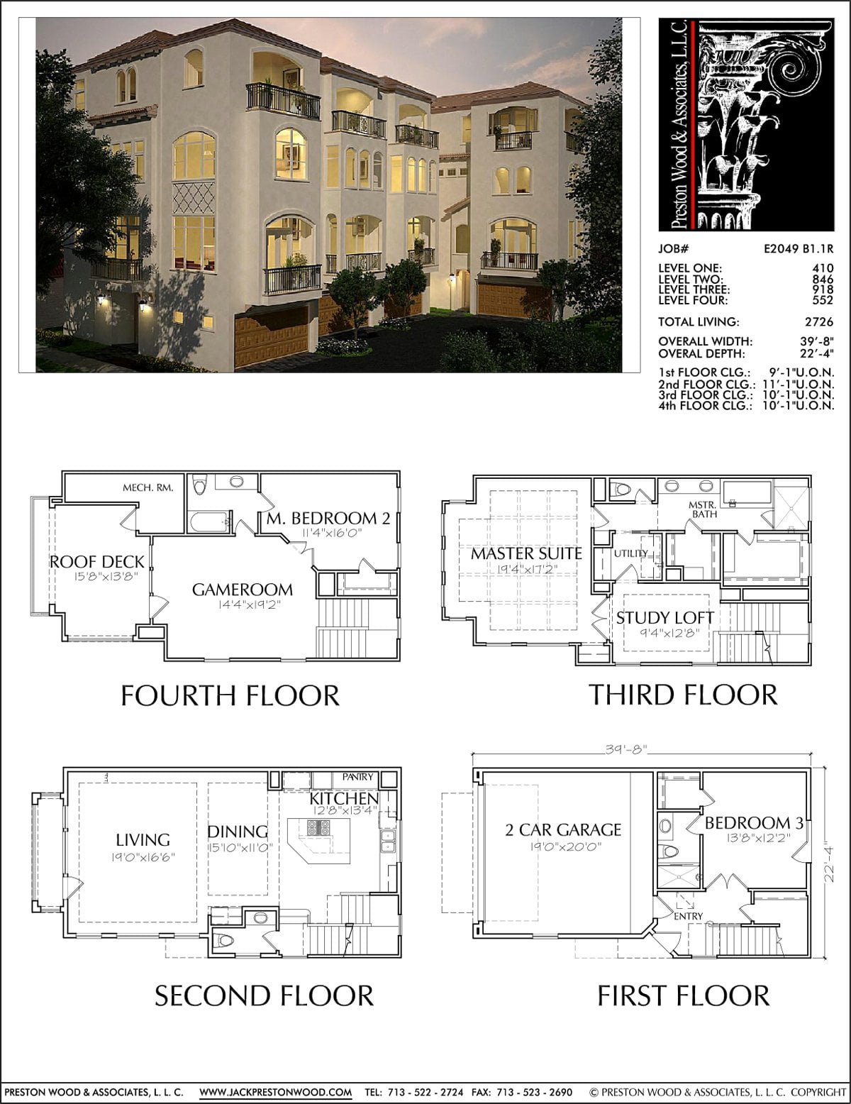 This duplex townhome plan has 2726 square ft. of living space. This duplex townhouse plan design has a width of 39′-8″ and a depth of 22′-4″.