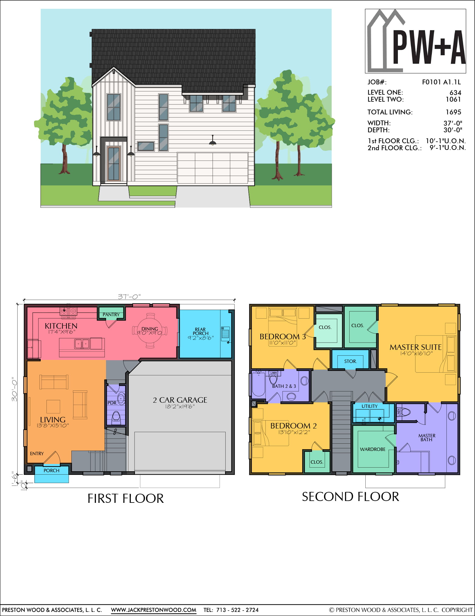 This home plan has a width of 37′-0” and a depth of 30′-0”. It includes three bedrooms and 2 1/2 baths. Highlights include the upstairs utility room and the spacious master suite!