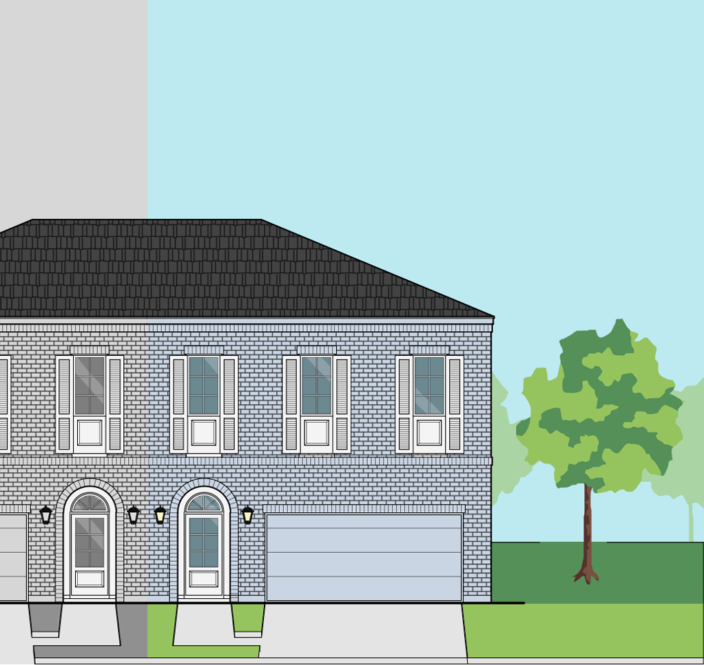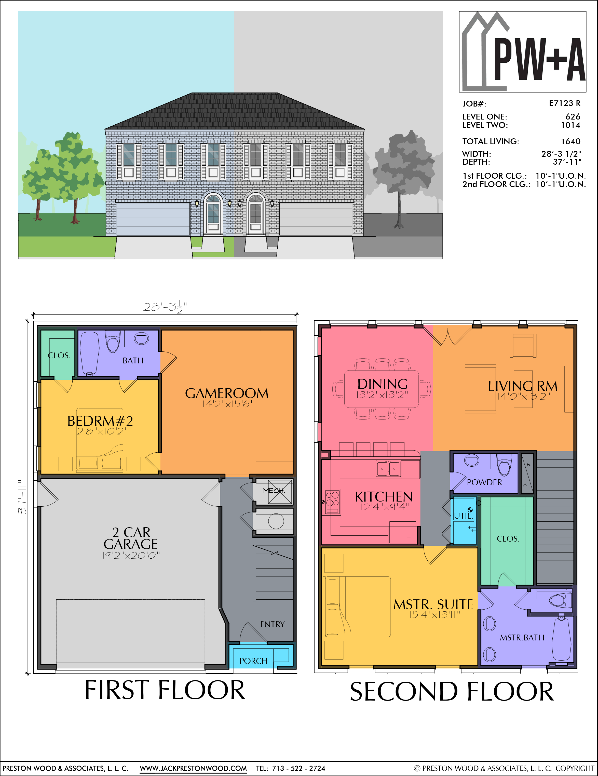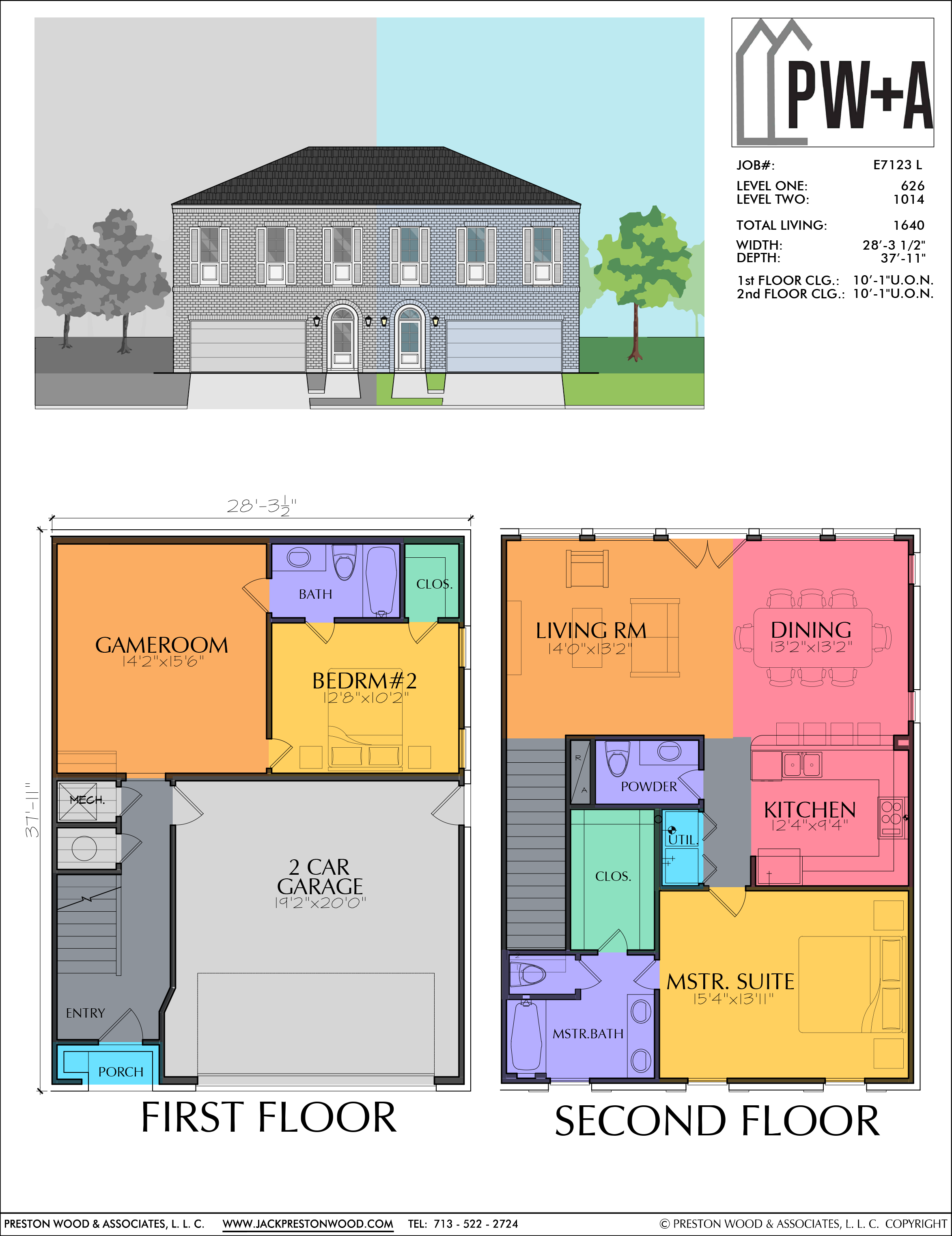 This plan has two bedrooms and 2 1/2 baths. The dimensions of the foundation are a width of 28′-3 1/2” and a depth of 37′-11”. Highlights include the compact design, the peninsula breakfast bar in the kitchen, and spacious master suite. Right and left versions are available as well as a duplex.
