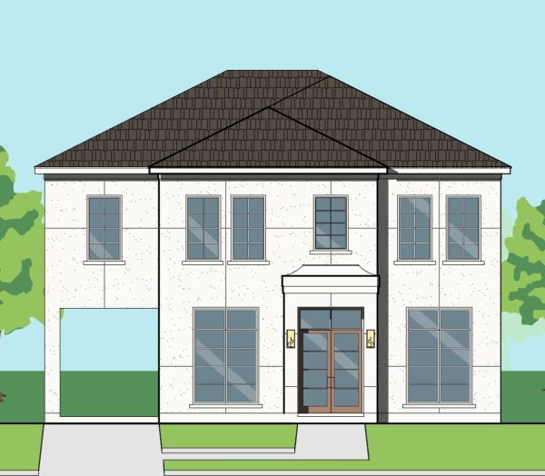 This plan has three bedrooms and 3 1/2 baths. The dimensions of the foundation are a width of 43′-10” and a depth of 63′-11 1/2”. Highlights include the sprawling master suite, the library, and walk-in pantry.