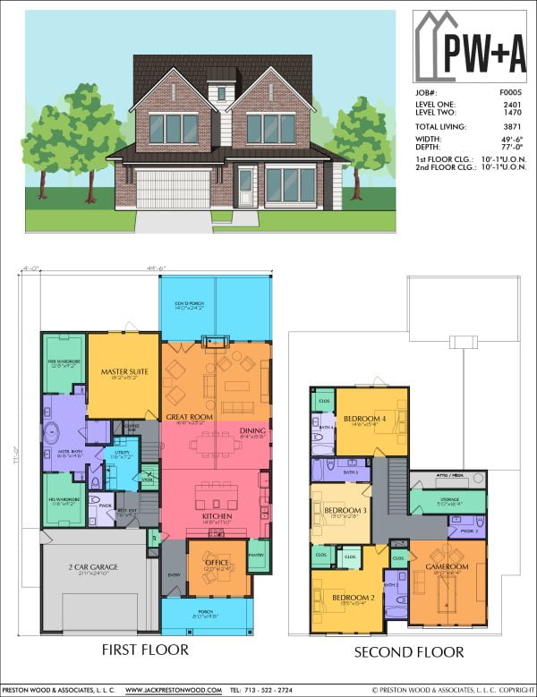 This plan has four bedrooms, four full baths, and two half baths. The dimensions of the foundation are a width of 49′-6” and a depth of 77′-0”. The game room, extra storage space, office space, and the large covered back porch are just a few of the wonderful aspects of this home!