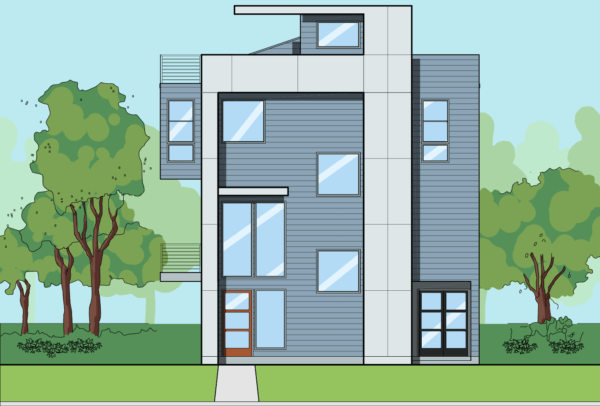 Measurements are: depth of 26′-10” and width of 33′-8″. This plan includes 3 bedrooms and 3 and a half baths. Some cool aspects of the house are the 2-car garage, open kitchen with a large island, a second-floor balcony, a walk-in closet for the master suite, the roof deck, and ample attic storage space.