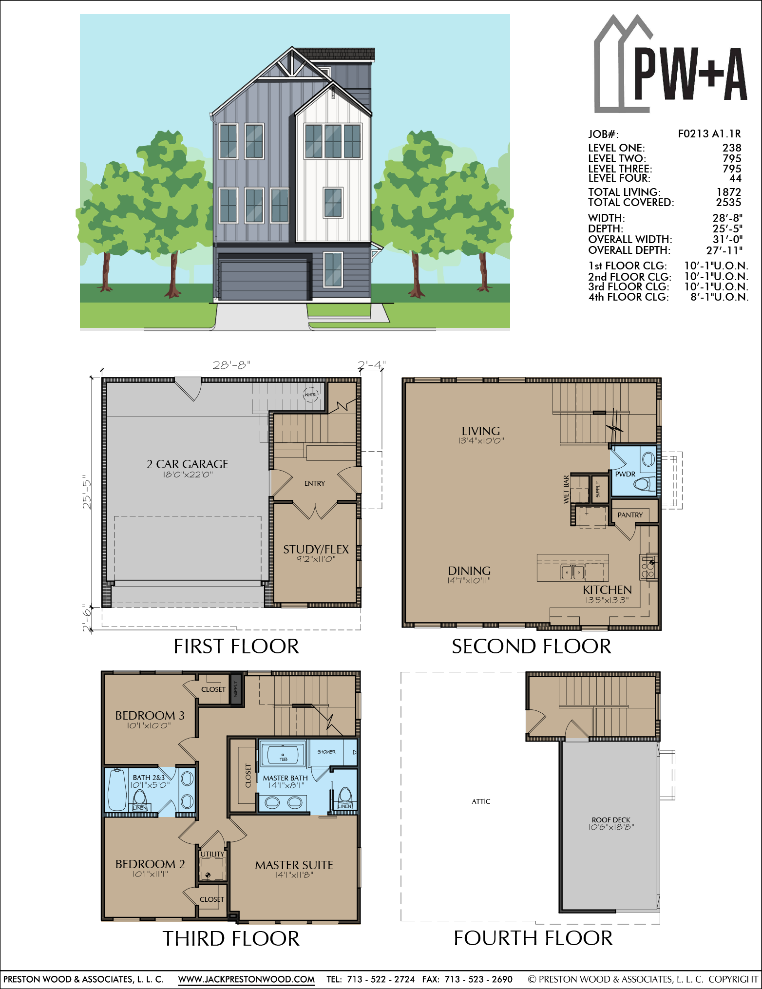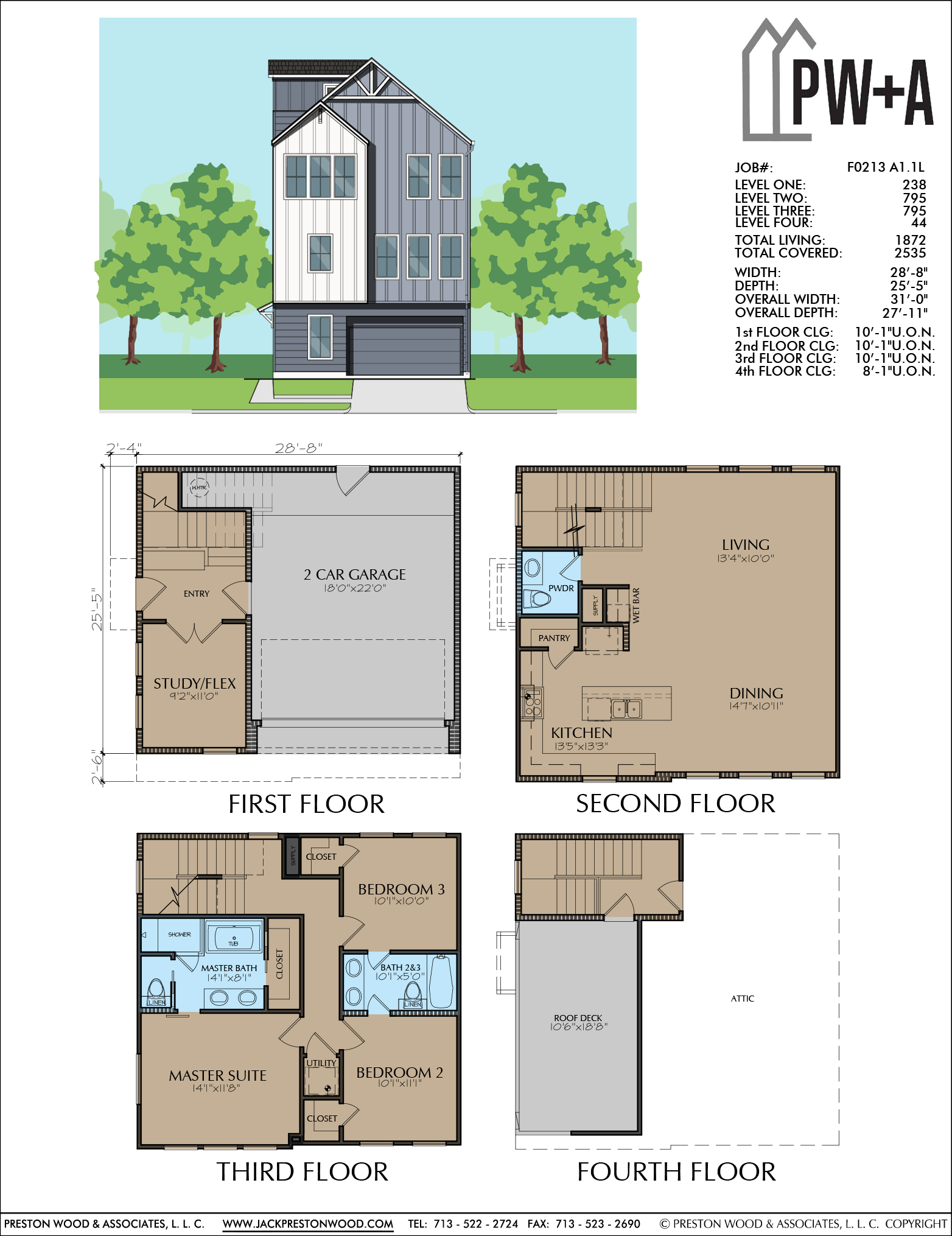 Measurements are: 1872 square ft. of living space and has a width of 28′-8” and a depth of 25′-5″. This plan has three bedrooms and 2 1/2 baths. Highlights include the spacious master suite with a large bath and the roof deck.