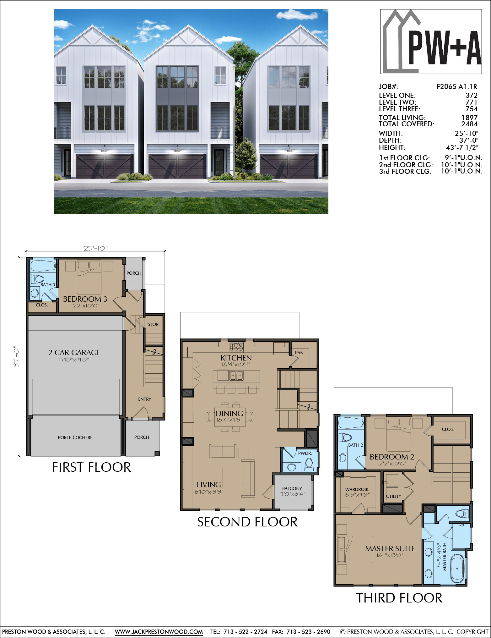 Measurements are: 1897 square ft. of living space and has a width of 25′-10” and a depth of 37′-0″. This plan has three bedrooms and 3 1/2 baths. Highlights include the spacious master suite, an upstairs utility room, and a balcony off of the living area.