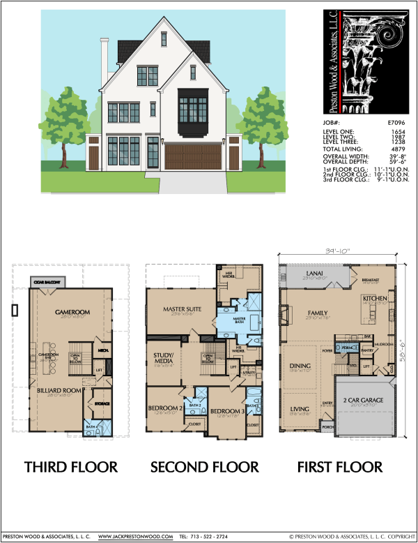 The measurements of this plan are a width of 39′-8″ and a depth of 59′-6″. This plan has three bedrooms and 4 1/2 baths. Highlights include a large master suite, a spacious game room with a bar and billiard area, and a lanai with space for a grill.