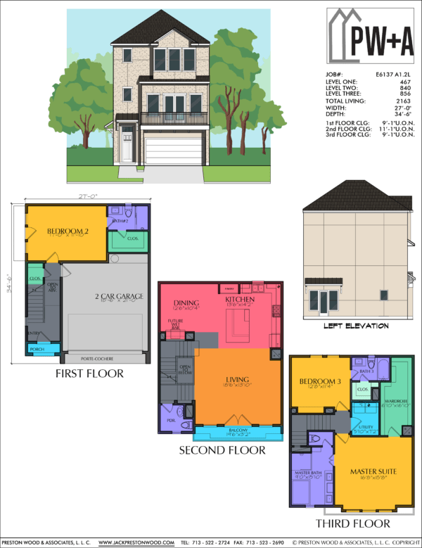 Measurements are: 2163 square ft. of living space and has a width of 27′-0” and a depth of 34′-6″. This plan has 4 bedrooms and 3 and a half baths. Some highlights of this more affordable plan include the 2-car garage, a kitchen with a lot of counter space and an island, a large balcony, as well as a spacious master bedroom, bathroom, and closet.