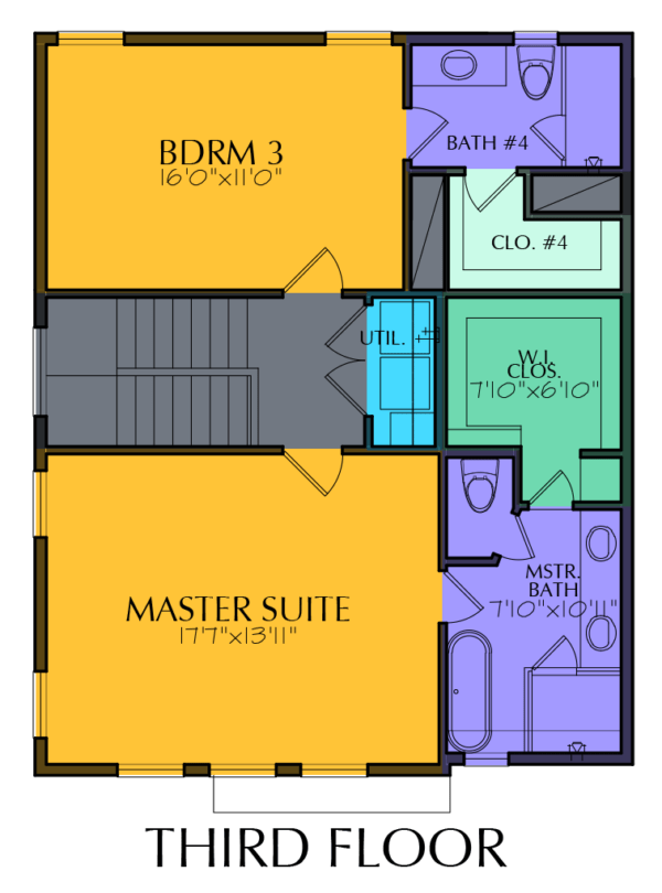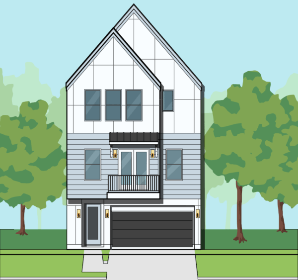Measurements are: 2138 square ft. of living space and has a width of 26′-9” and a depth of 32′-9″. This plan has 3 bedrooms and 4 baths. Highlights of this compact plan include the 2-car garage, the balcony off of the master bedroom, the study area, and the fact that all bedrooms have their own bathroom and closet!