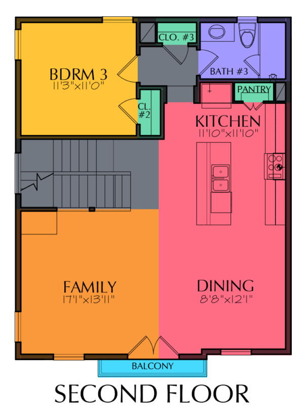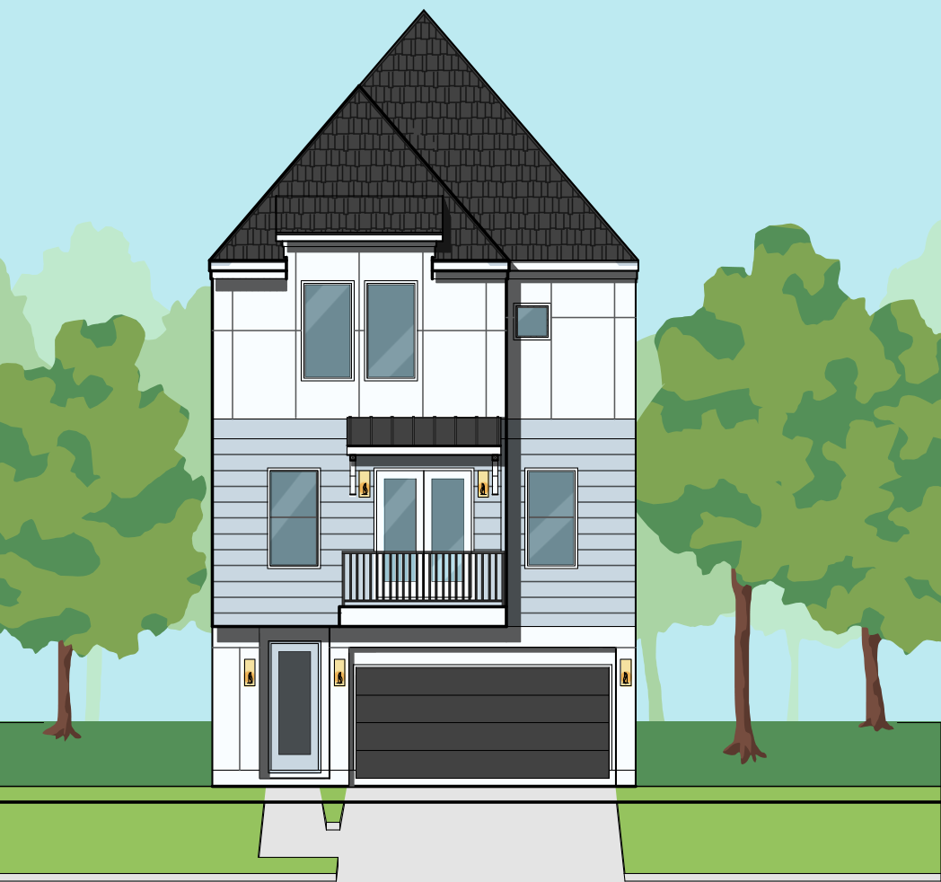 Measurements are: 2138 square ft. of living space and has a width of 26′-9” and a depth of 32′-9″. This plan has 3 bedrooms and 4 baths. Highlights of this compact plan include the 2-car garage, the balcony off of the master bedroom, the study area, and the fact that all bedrooms have their own bathroom and closet!