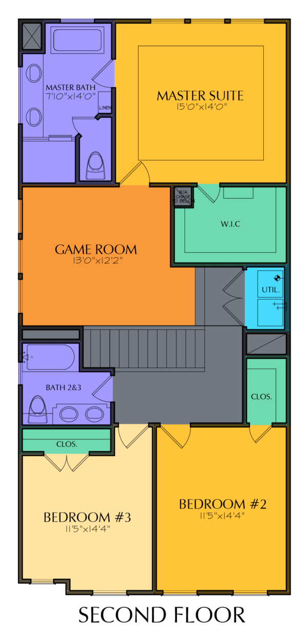 This two-story home has 1782 square ft. of living space. Highlights of the first floor are a 2-car garage and an open concept layout. The second-floor sports a master suite, 2 bedrooms, a game room, as well as an upstairs laundry room for easy access. See the photo gallery for variations on the elevations of this plan.