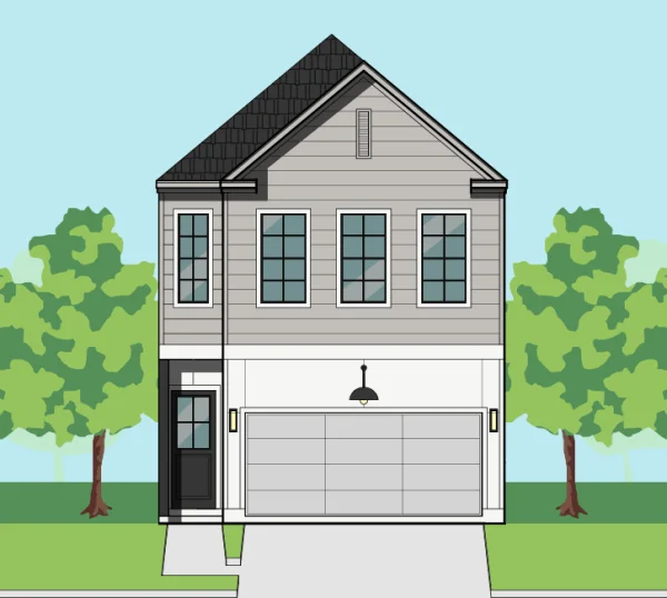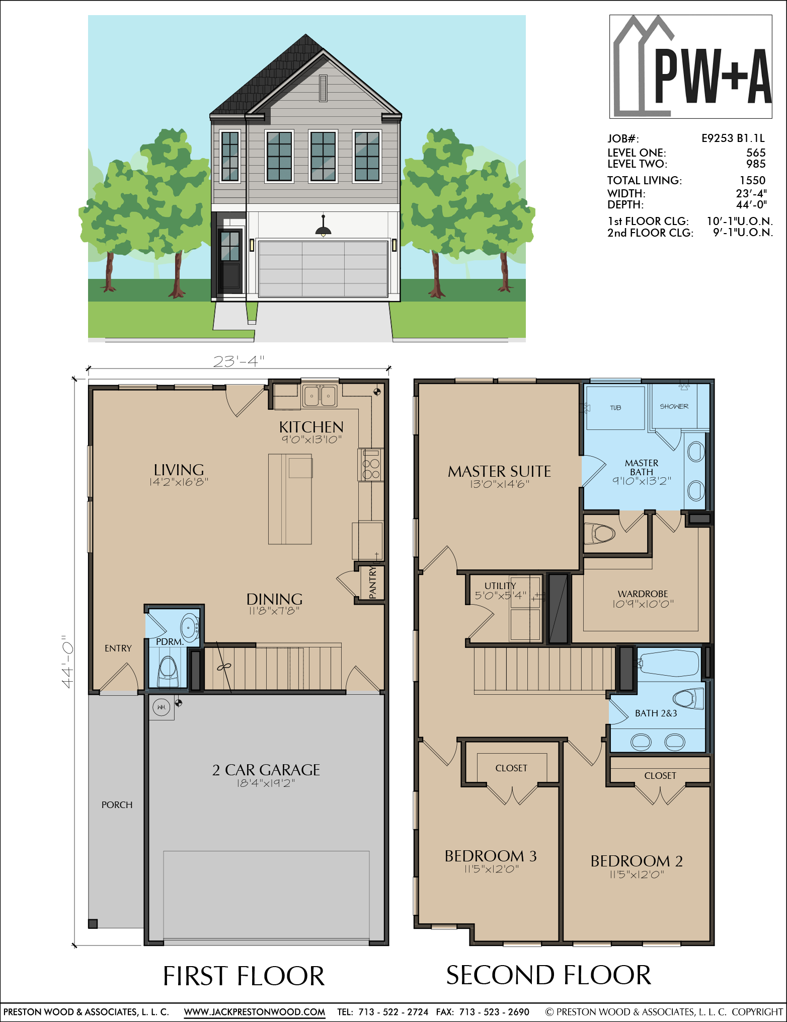 Measurements are: 1550 square ft. of living space and has a width of 23′-4” and a depth of 44′-0″. This plan has 3 bedrooms and 2 1/2 baths. Highlights include the two-car garage, the spacious master suite, and the open-concept living area! There are four elevations for this plan.