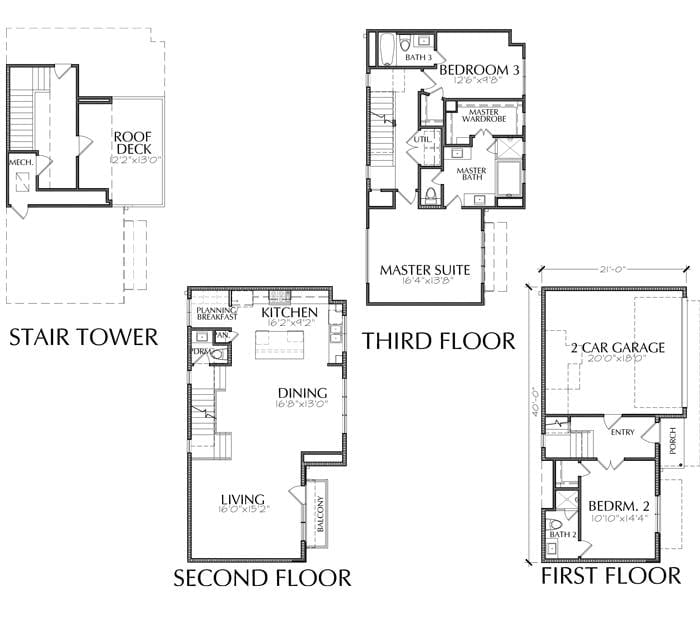 This townhome plan has 2136 square ft. of living space. This townhouse plan design has a depth of 21′-0″ and a width of 40′-0″. A flipped (mirrored) version of this plan is available.