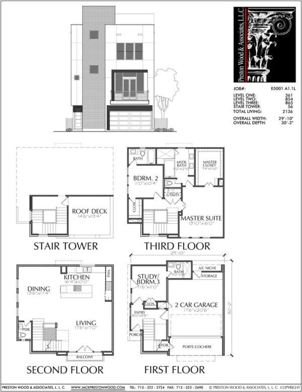 This townhome plan has 2136 square ft. of living space. This townhouse plan design has a width of 29′-10″ and a depth of 30′-2″. There is a flipped (mirrored) version of this plan available.