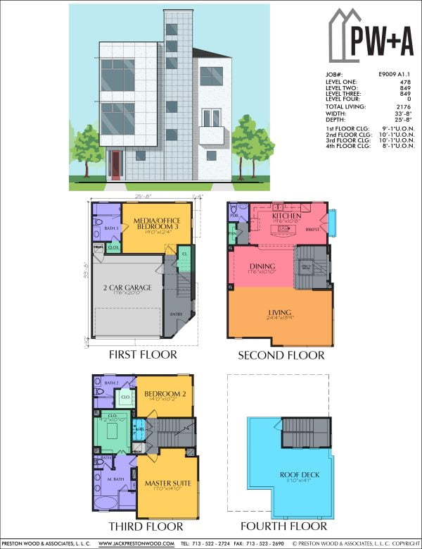This townhome plan has a width of 33′-8” and a depth of 25′-8”. It includes three bedrooms and 3 1/2 baths. Highlights include the roof deck, spacious master suite, and open-concept second floor that’s great for entertaining!