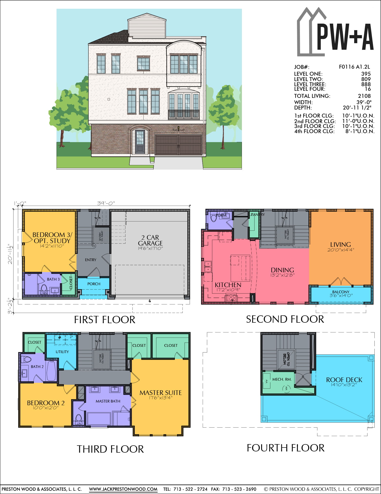 This townhome plan has a width of 39′-0” and a depth of 20′-11 1/2”. It includes three bedrooms and 3 1/2 baths. Highlights include the open roof deck, the second-floor balcony, and the sprawling master suite! Also check out the other plans in this project at F0116 A1.1 and F0116 A1.3.
