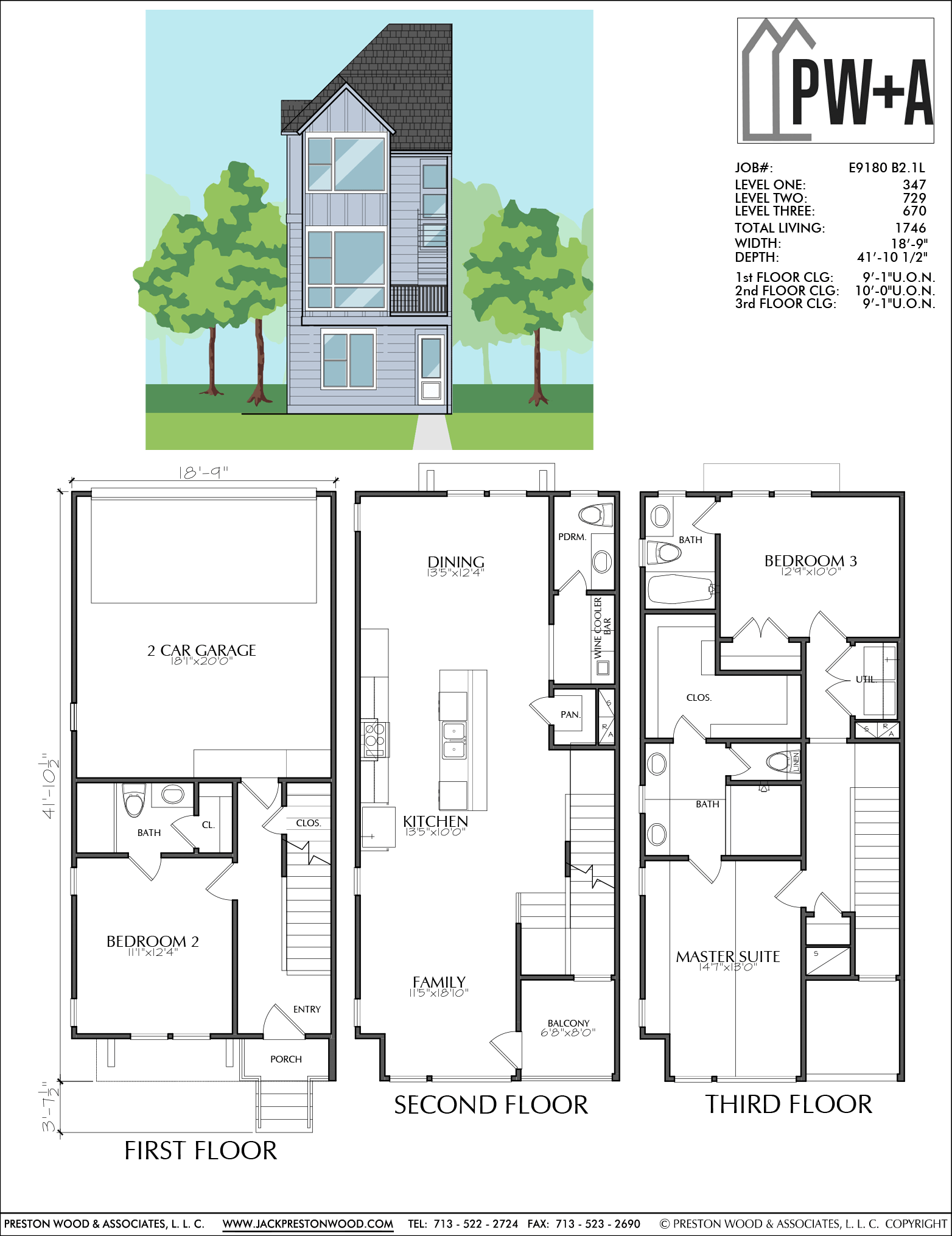 This townhome plan has a width of 18′-9” and a depth of 41′-10”. It includes three bedrooms and 3 1/2 baths. Highlights include the spacious kitchen with a large island, the second-floor balcony, and the fact that every bedroom has its own bathroom! Right and left versions of this plan are available. Check out the duplexes that include this plan as well as E9180 A1.1, A1.2, A1.3, A Duplex 1, A Duplex 2, E9180 B1.1, B1.2, B2.2, B Duplex 3.