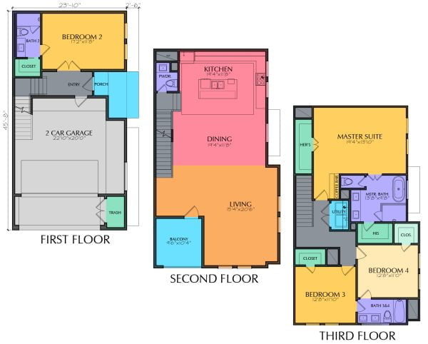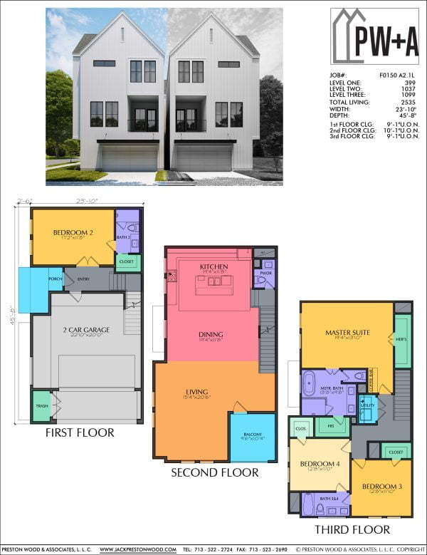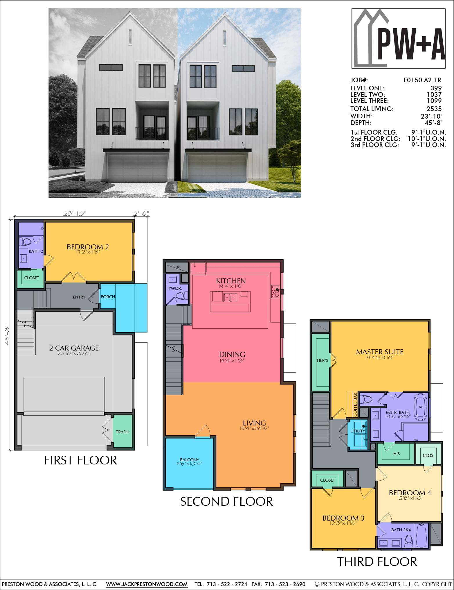 This townhome plan has a width of 23′-10” and a depth of 45′-8”. It includes four bedrooms, three full baths, and one half bath. The open concept second floor is perfect for entertaining family and friends. The spacious master suite includes two closets, a large bathroom, and even a coffee bar! This plan goes well with F0150 A1.1 and F0150 A1.2. It also has a right and left version.