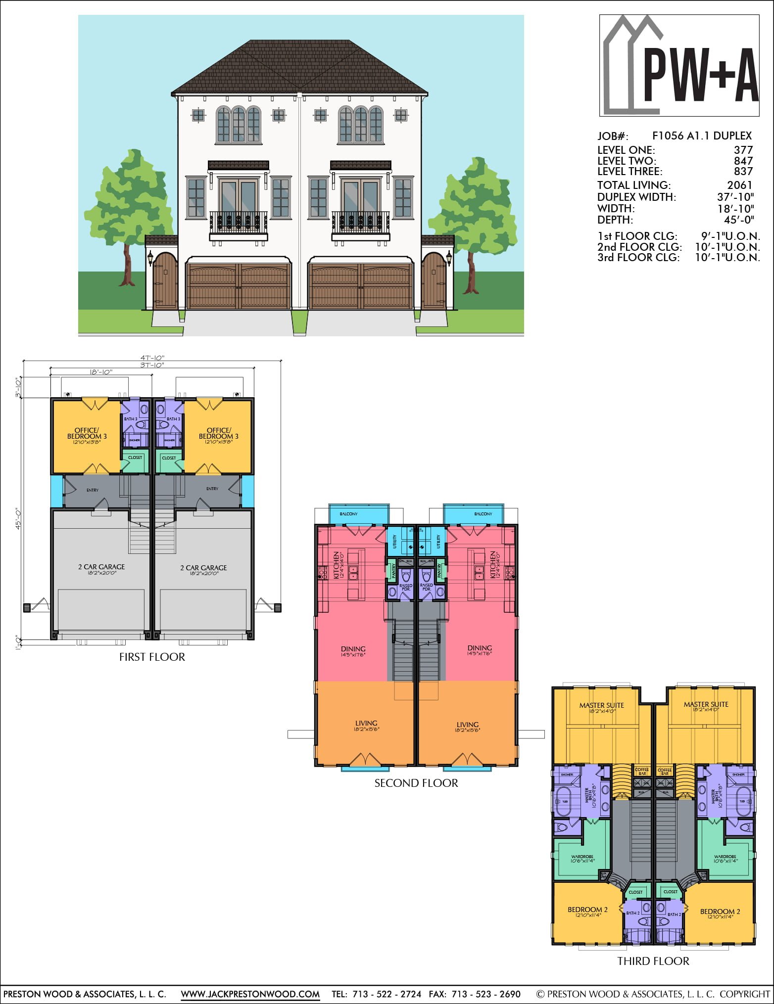 This townhome plan has a width of 47′-10” (duplex)/ 23′-10” (single) and a depth of 45′-0”. It includes three bedrooms and 3 1/2 baths. Highlights include the spacious master suite with a coffee bar and the balcony right off of the kitchen! Each side of this plan can be purchased separately here.