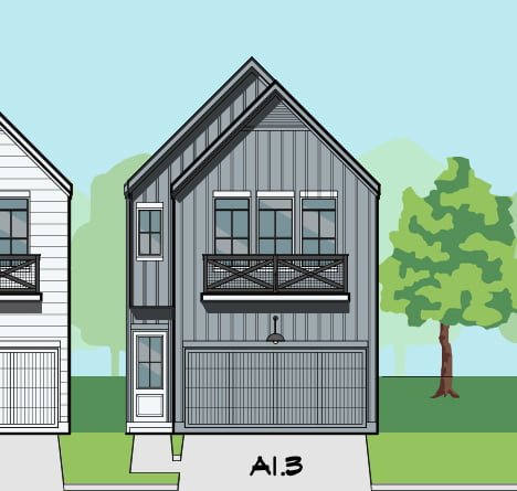 This townhome plan has a width of 22′-2” and a depth of 56′-10”. It includes three bedrooms and 2 1/2 baths. Highlights include the spacious master suite and the conveniently-placed upstairs utility room! Check out F0297 A1.1 and F0297 A1.2 for slight variations to this plan!