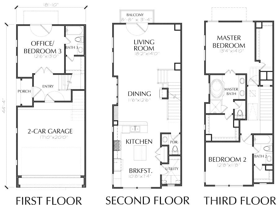 This townhome plan has 1993 square ft. of living space. This townhouse plan design has a width of 18′-10″ and a depth of 44′-4″. There is a flipped (mirrored) version of this plan available.