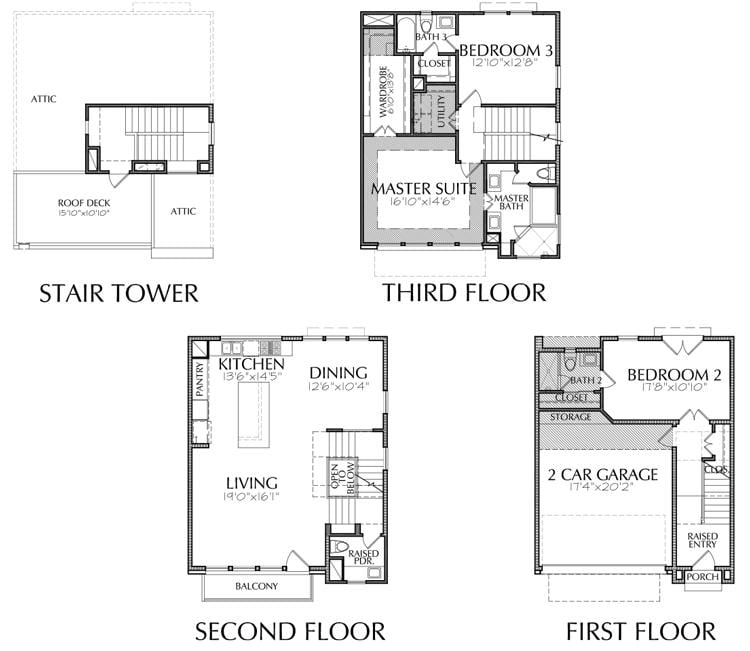 This townhome plan has 2085 square ft. of living space. This townhouse plan design has a width of 25′-10″ and a depth of 32′-0″.