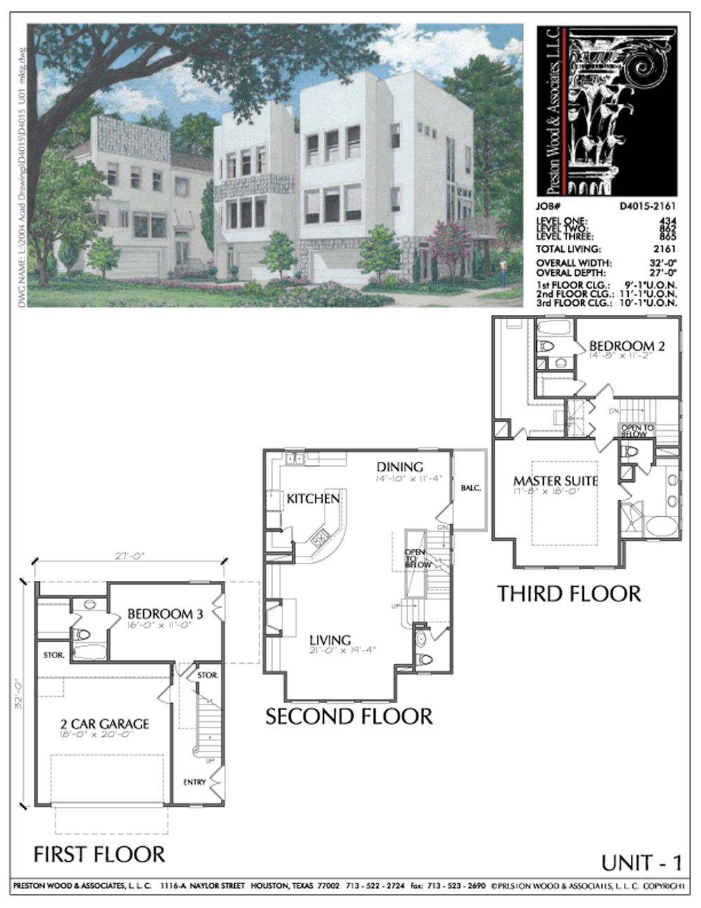 This townhome plan has 2161 square feet of living space. This townhouse plan has a width of 27′-0″ and a depth of 32′-0″. This town home plan is sold as part of a multi-unit building, for single floor plan purchases or plan modifications please call us.