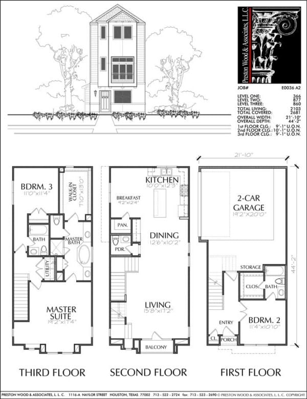 This townhome plan has 2103 square ft. of living space. This townhouse plan design has a width of 21′-10″ and a depth of 44′-2″.