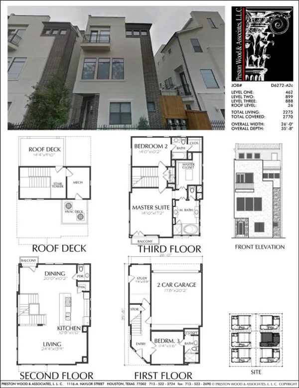 This townhome plan has 2275 square ft. of living space. This townhouse plan design has a width of 26′-0″ and a depth of 35′-8″.