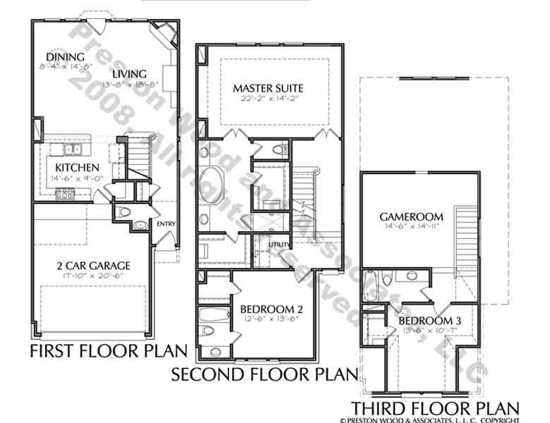 This townhome plan has 2324 square feet of living space. This townhouse plan has a depth of 49′-3 1/2″ and a width of 22′-10″.