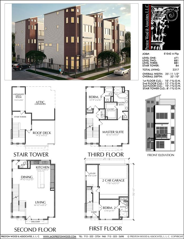 This townhome plan has 2317 square ft. of living space. This townhouse plan design has a width of 25′-11 1/2″ and a depth of 32′-10″.