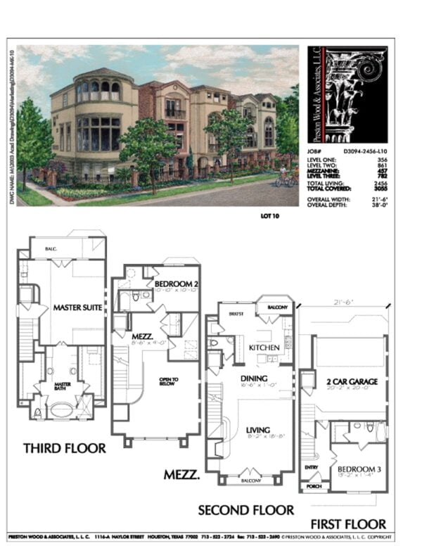 This townhome plan has 2456 square feet of living space. This townhouse plan has a depth of 38′-0″ and a width of 21′-6″.