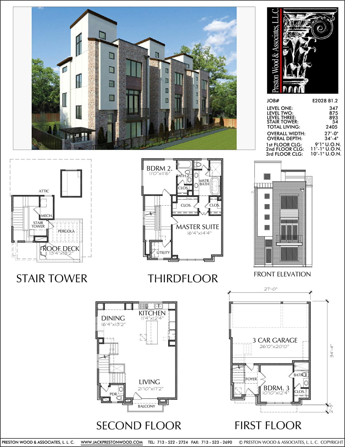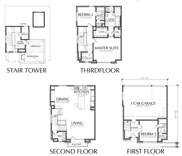 This townhome plan has 2169 square ft. of living space. This townhouse plan design has a width of 27′-0″ and a depth of 34′-4″.