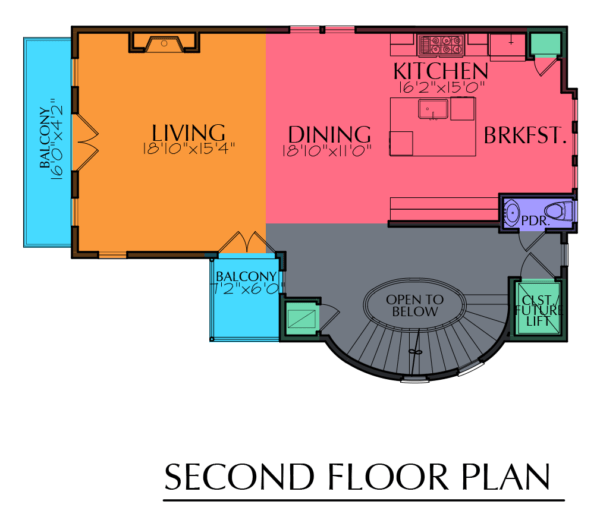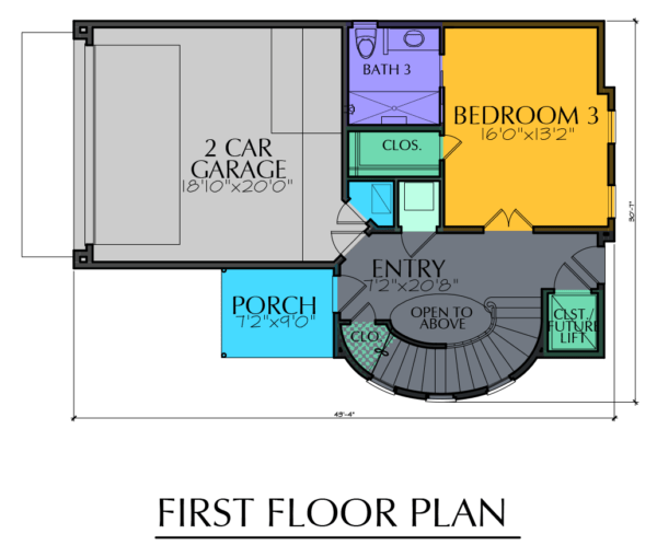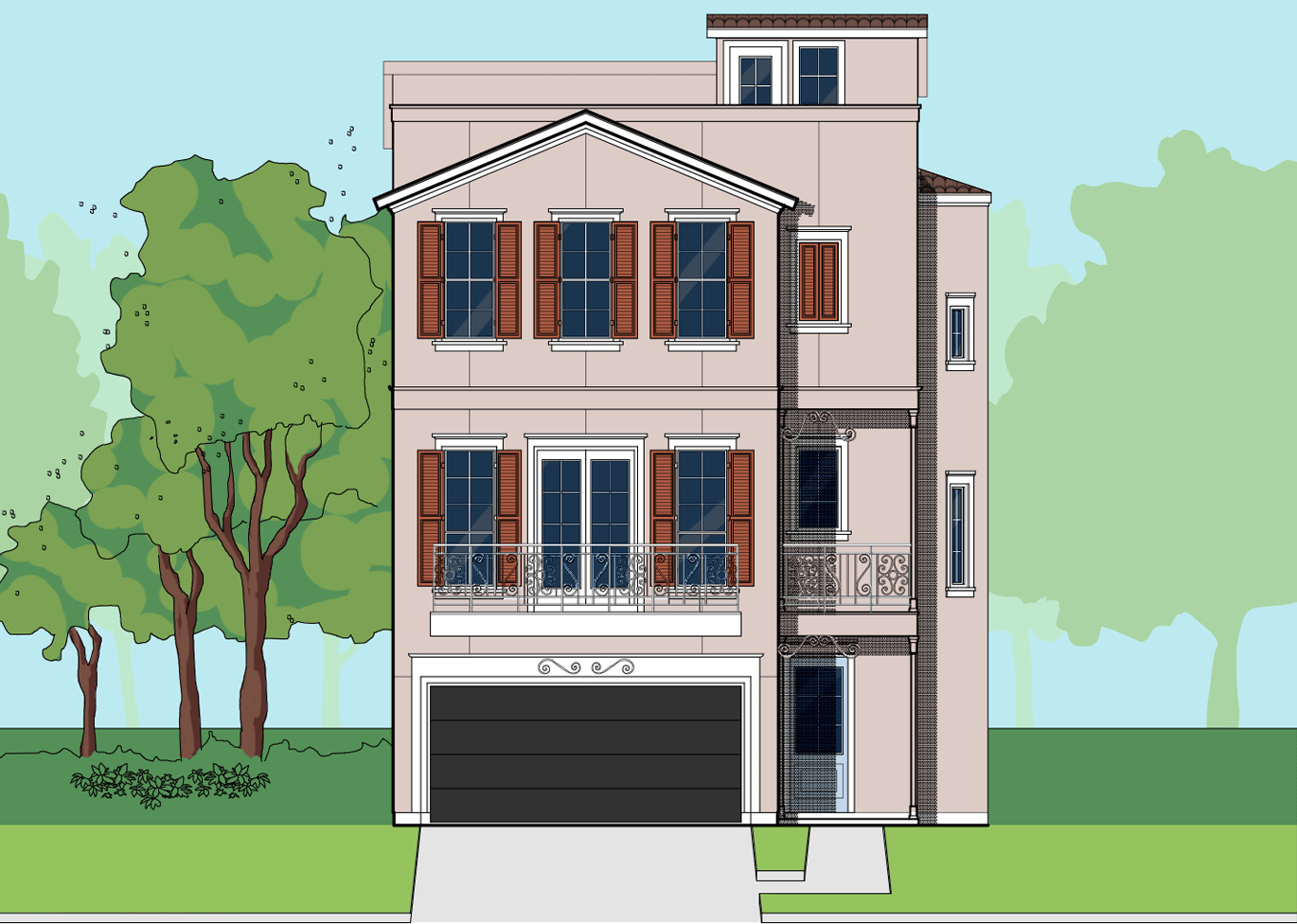 Measurements are: 2782 square ft. of living space and has a width of 30′-4 5/16” and a depth of 43′-4″. This plan has 3 bedrooms and 3 and a half baths. A great aspect of this house is how easy it is to enjoy the outdoor view with the two balconies and the large roof deck! Other highlights include the island and breakfast nook in the kitchen, the walk-in closet for the master suite, and two-car garage.