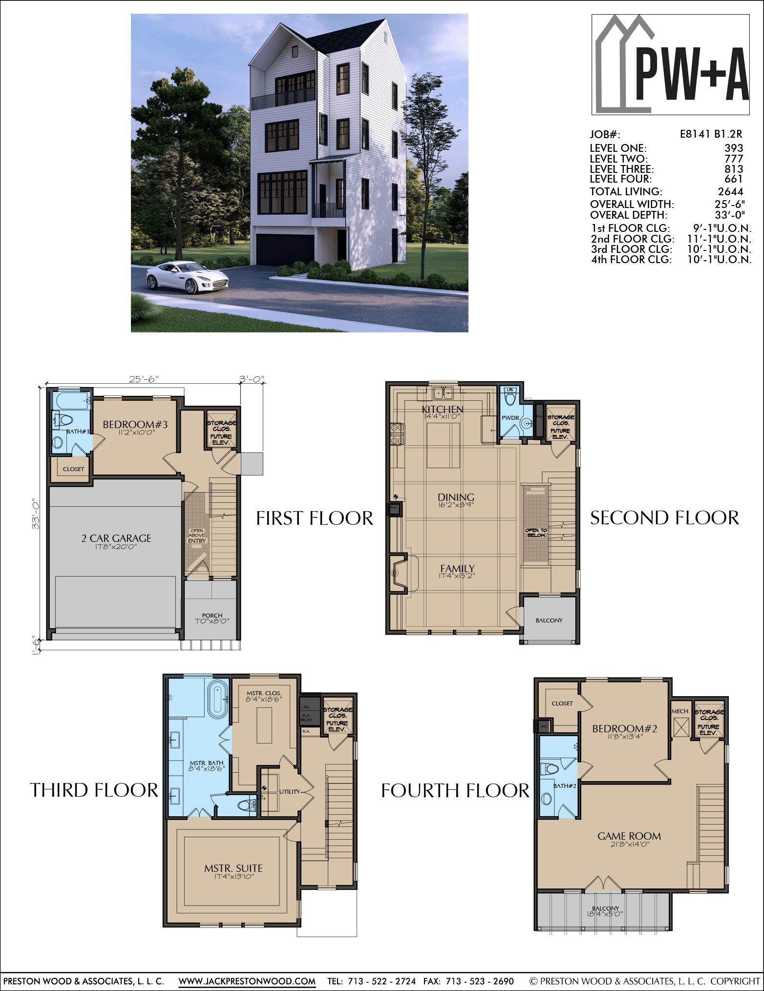 Measurements are: 2644 square ft. of living space and has a width of 25′-6” and a depth of 31′-6″. This plan has 3 bedrooms and 3 and a half baths. Highlights include the two balconies, the game room, two-car garage, and spacious master suite.