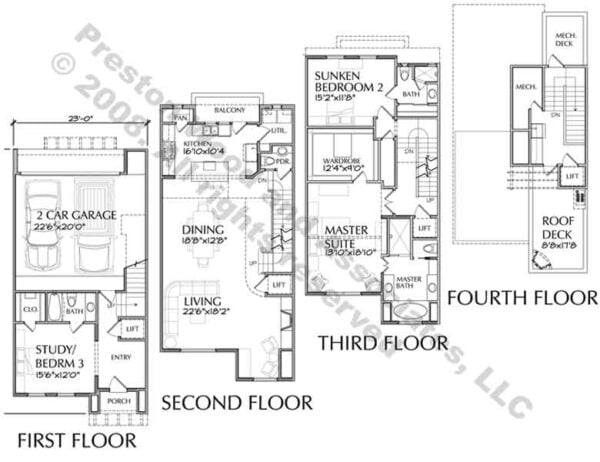 This townhome plan has 2649 square ft. of living space. This townhouse plan design has a depth of 45′-6″ and a width of 23′-0″. This town home plan is sold as part of a multi-unit building, for single floor plan purchases or plan modifications please call us.
