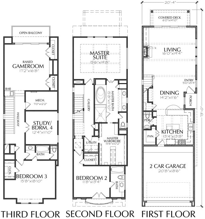 This townhome plan has 3196 square ft. of living space. This townhouse plan design has a width of 20′-4″ and a depth of 73′-0″.
