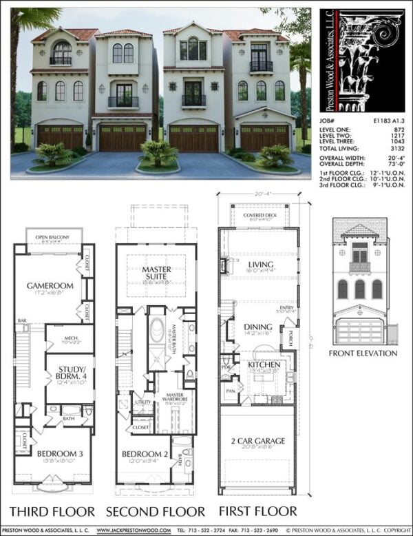 This townhome plan has 3132 square ft. of living space. This townhouse plan design has a width of 20′-4″ and a depth of 73′-0″.