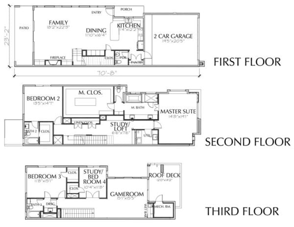 This townhome plan has 3428 square ft. of living space. This townhouse plan design has a width of 23′-2″ and a depth of 70′-8″.
