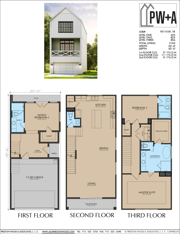 This three bedroom, 3 1/2 bath townhome has an open-concept second floor with a balcony overlooking the front yard. The master suite has an impressive walk-in closet and a spacious bathroom as well. The dimensions of the foundation are a width of 20′-0” and a depth of 45′-6”. There is a left and right version of this plan and it pairs well with F0110 A1.2.
