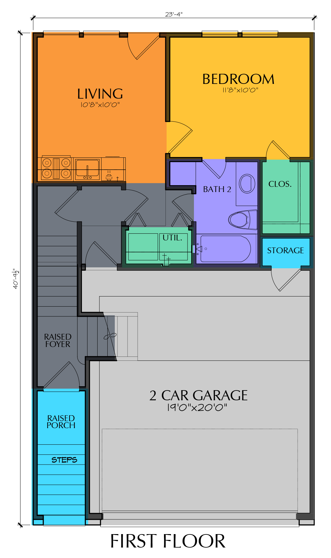Measurements are: 1396 square ft. of living space and has a width of 23′-4” and a depth of 40′-9 1/2″. This economic home plan includes 2 bedrooms and 2 and a half baths. Some highlights are the two-car garage, two living areas, and two walk-in closets for the master suite.