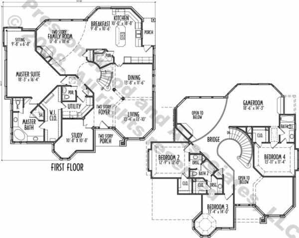 This two-story home plan has 3495 square ft. of living space. This two-story house plan design has a depth of 52′-11″ and a width of 52′-5 1/2″.