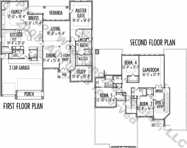 This two-story home plan has two floor plans. This two-story house plan design has a depth of 65′-7″ and a width of 61′-1″.