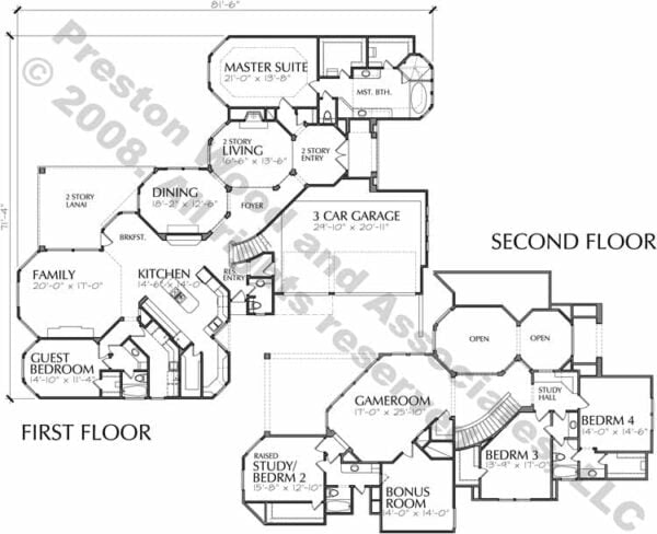 This two-story house plan has 4276 square ft. of living space. This two-story home design plan has a depth of 81′-6″ and a width of 71′-4″.