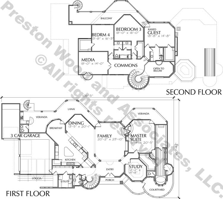 This two-story house plan has 4433 square ft. of living space. This two-story home plan design has a depth of 60′-4″ and a width of 106′-5″.