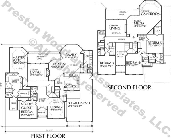 This two-story house plan has 4559 square ft. of living space. This two-story home plan design has a depth of 65′-0″ and a width of 69′-0″.