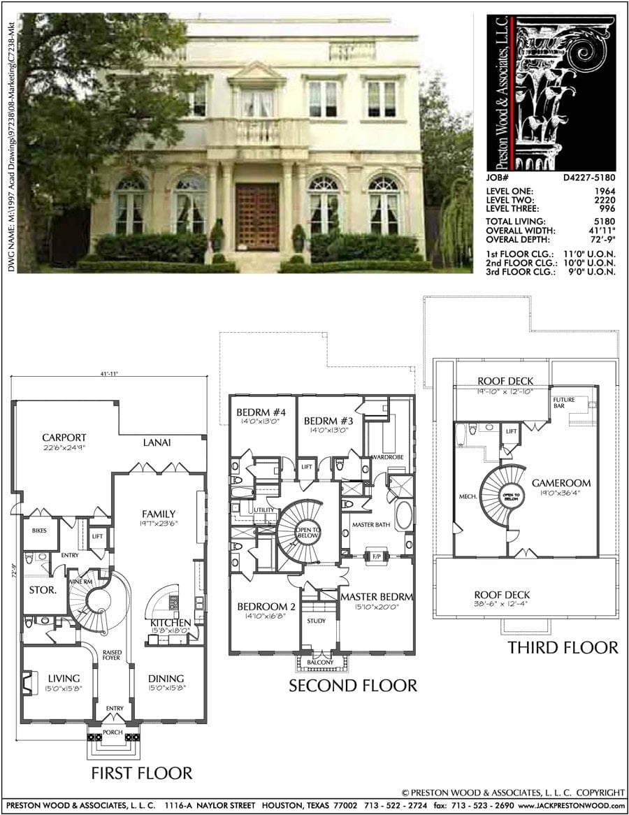 This three story house plan has 5180 square ft. of living space. This three story home plan design has a depth of 56′-4″ and a width of 41′-11″.