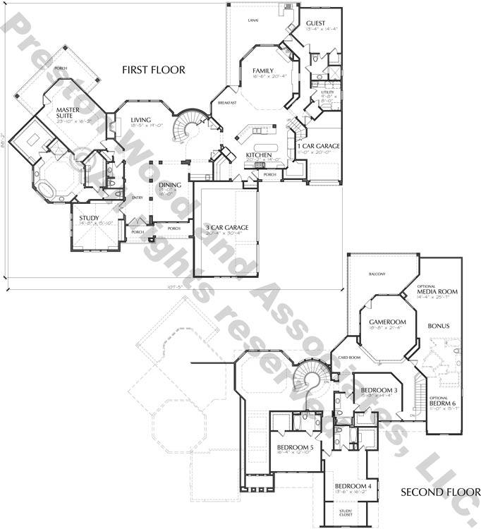 This two-story house plan has 5710 square ft. of living space. This two-story home plan design has a depth of 88′-2″ and a width of 107′-5″.