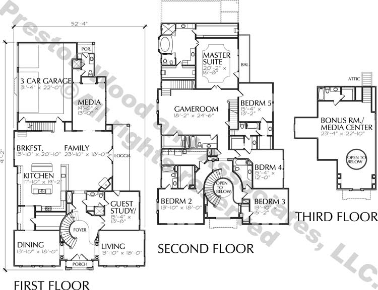 This three-story house plan has 6917 square ft. of living space. This two-story home plan design has a depth of 91′-2″ and a width of 52′-4″.