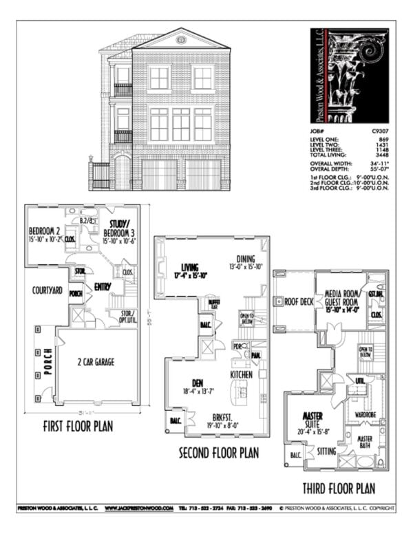 This inner city urban home plan has 3379 square feet of living space. This three-story urban house plan design has a width of 31′-11″ and a depth of 55′-7″.