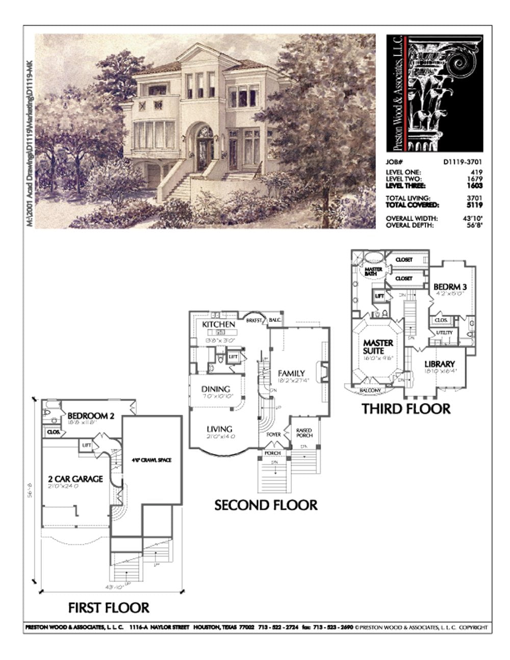 This three-story inner city urban home plan has 3701 square feet of living space. This three-story urban house plan design has depth of 56′-8″ & width of 43′-10″.